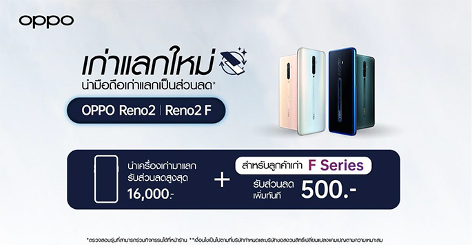 ใครสนใจก็สามารถไปจับจองเป็นเจ้าของกันได้แล้ววันที่ OPPO Brand Shop และร้านค้าตัวแทนจำหน่ายทั่วประเทศ โดย OPPO Reno2 F จะมีให้เลือก 2 สี คือ สีเขียว Lake Green และสีขาว Sky White และพิเศษสุด! สำหรับคนที่ใช้ OPPO F Series อยู่แล้ว สามารถนำเครื่องเก่ามาเข้าแคมเปญ "เก่าแลกใหม่" แลกรับเป็นส่วนลดเมื่อจองหรือซื้อ OPPO Reno2 Series และรับส่วนลดเพิ่มอีก 500 บาท ที่ OPPO Brand Shop, BaNANA, BKK by Com7, KingKongPhone และ Jaymart