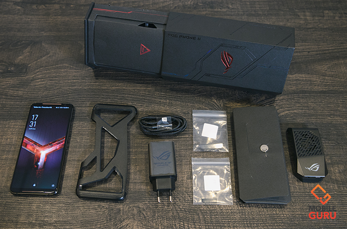 กล่องของ ROG Phone II ยังคงมาแบบอลังการงานสร้างเหมือนเดิม โดยตัวกล่องมาในทรงปริซึม (Prism) ห้าเหลี่ยม พร้อมเล่นลวดลาย ROG บนพื้นผิวของกล่อง เมื่อสไลด์ออกมาจะพบกับอุปกรณ์ภายในกล่อง ดังนี้