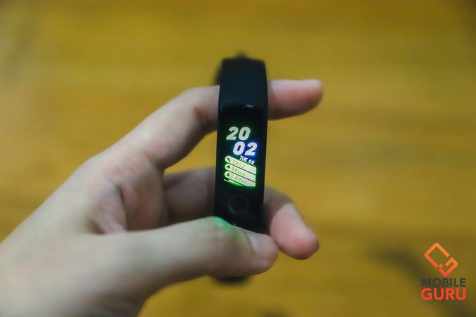 Honor Band 5 มาพร้อมหน้าจอสีแบบสัมผัส AMOLED สีสันสวยสดใสมากๆ ขนาดหน้าจอ 0.95 นิ้ว ความละเอียด 120 x 240 pixels กระจกกันรอยขีดข่วงได้ดี ผมใช้งานไม่ค่อยระวังก็ไม่เกิดริ้วรอยเลยครับ ด้านล่างจะเป็นปุ่ม Home ระบบสัมผัส ออกแบบเป็นวงกลมสีเงิน ด้านหลังมีเซ็นเซอร์ และขั้วชาร์จ รวมทั้งโลโก้ของ Honor