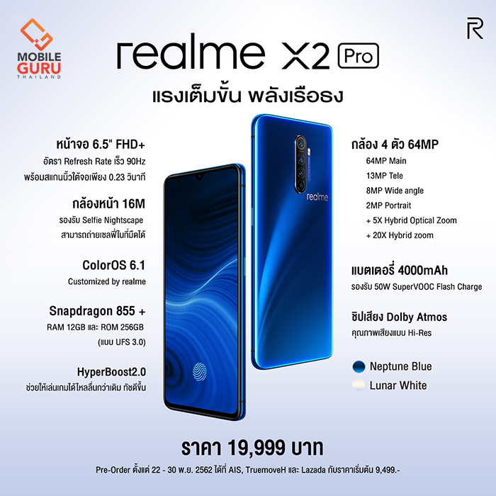 สำหรับใครที่สนใจ realme X2 Pro จะวางจำหน่ายในราคา 19,999 บาท โดยสามารถ Pre-Oder ผ่านทาง เอไอเอส, ทรูมูฟ เอช และช่องทางออนไลน์ Lazada ได้ตั้งแต่วันที่ 22 พ.ย. - 30 พ.ย. 2562 ในราคาเริ่มต้นเพียง 9,499 บาท พร้อมรับฟรี! realme Buds Wireless 1,999 บาท , VIP Card ประกันจอแตก นาน 12 เดือน และประกันตัวเครื่อง นาน 24 เดือน (วางจำหน่ายอย่างเป้นทางการ 1 ธ.ค. 2562)