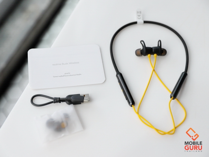 realme Buds Wireless มีให้เลือก 2 สีครับ ได้แก่ สีแดง และสีดำ (สายสีเหลือง) วัสดุดูดี ดีไซน์สวย และมีน้ำหนักเบาหวิวเพีง 30 กรัมเท่านั้น ตัวหูฟังมีความยืดหยุ่นสูง และปลายทั้ง 2 ด้านหุ้มด้วยโลหะ ในกล่องจะมีหูฟัง, จุกยางอีก 2 ขนาด, สาย microUSB, คู่มือ