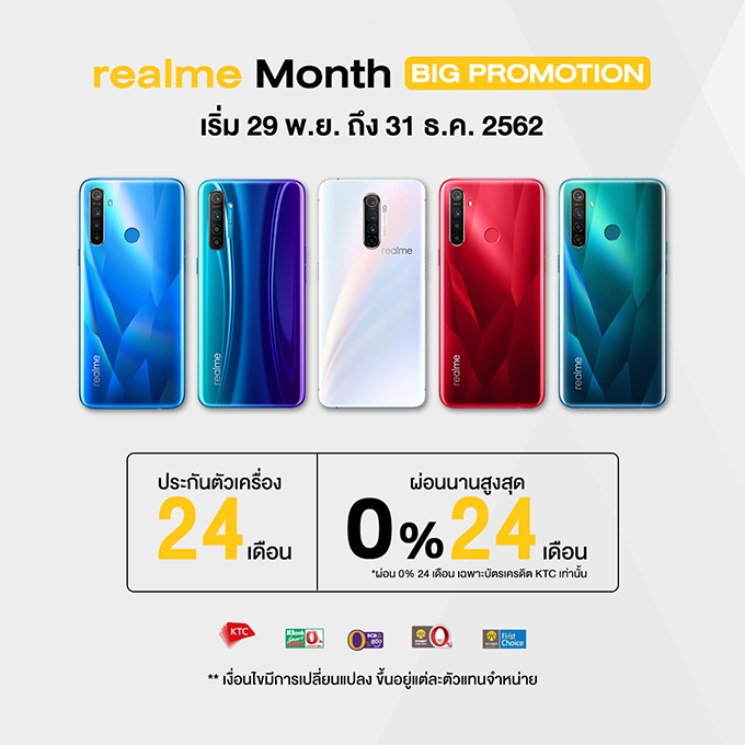 พร้อมด้วยโปรโมชั่น realme Big Month Promotion สำหรับผู้ที่ซื้อสมาร์ทโฟน realme ทุกรุ่น ผ่านทุกช่องทาง ตั้งแต่วันนี้ - 31 ธ.ค. 62 ห้ามพลาด! ช่วงเวลาสุดคุ้มในการซื้อสมาร์ทโฟนจากเรียลมี พร้อมผ่อน 0% กับทุกบัตรเครดิตที่ร่วมรายการ สูงสุดยาวนานถึง 24 เดือน โปรโมชั่นดีๆ ขนาดนี้ไม่ควรพลาดครับ!