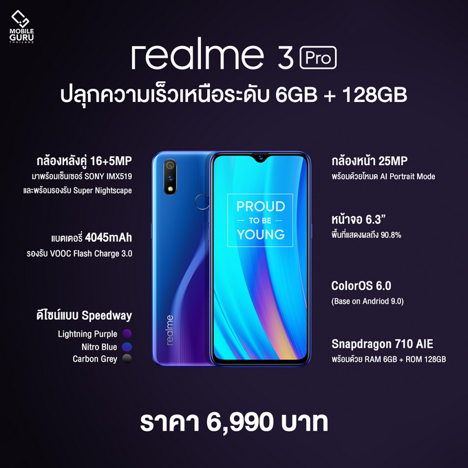 realme 3 Pro เป็นสมาร์ทโฟนจากแบรนด์ realme ที่น่าทึ่งมากๆ มาพร้อมดีไซน์พรีเมี่ยมที่สวยงามสะดุดตา ฝาหลังออกแบบไล่โทนสี สะท้อนแสง ดูคล้ายขนปีกของนกยูง นอกจากนี้ยังมาพร้อมสเปคที่น่าสนใจ หน้าจอหยดน้ำ IPS ขนาด 6.3 นิ้ว ความละเอียด Full HD+ ชิปเซ็ต Qualcomm Snapdragon 710, RAM 6GB/ROM 128GB รองรับ MicroSD กล้องคู่ความละเอียด 16MP F1.7 (Dual Pixel PDAF) + 5MP F2.4, มาพร้อมเซนเซอร์กล้อง Sony IMX 519, กล้องหน้าความละเอียด 25MP F2.0, รองรับบันทึกวีดีโอความละเอียด 4K 30FPS และสามารถบันทึก Super Slow Motion 720P 960FPS แบตเตอรี่ความจุสูง 4,045 mAh และเป็นครั้งแรกของสมาร์ทโฟนจาก realme ที่มาพร้อมที่มาพร้อมเทคโนโลยีชาร์จเร็ว VOOC 3.0 (สามารถชาร์จเต็ม 50% ใน 30 นาที) ราคา 6,999 บาท
