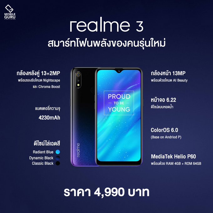 realme 3 สมาร์ทโฟนที่โดดเด่นในเรื่องของสเปค และราคา ดีไซน์ตัวเครื่องแบบไล่เฉดสวยงาม หน้าจอ IPS แบบหยดน้ำ ขนาด 6.22 นิ้ว, ความละเอียด HD+ ชิปเซ็ต Mediatek MT6771 Helio P60 RAM 4GB/ROM 64GB รองรับ MicroSD, คู่ความละเอียด 13MP F1.8 + 2MP F2.4 ซึ่งมาพร้อมฟีเจอร์ถ่ายภาพกลางคืน Nightscape และฟีเจอร์ชดเชยสี Chroma Boost, กล้องหน้าความละเอียด 13MP F2.0 พร้อมฟีเจอร์ Lossless Zoom 2X และกล้องหน้า Selfie ได้อย่างสวยงามมากครับ แบตเตอรี่ความจุสูง 4,230 mAh โดยวางจำหน่ายในราคา 4,990 บาท