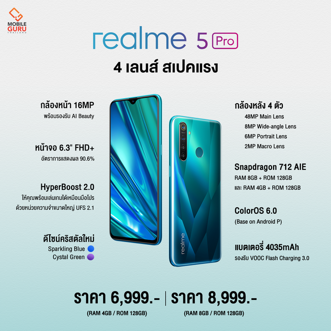 - realme 5 Pro รุ่น RAM 4GB/ROM 128GB ราคา 6,999 บาท