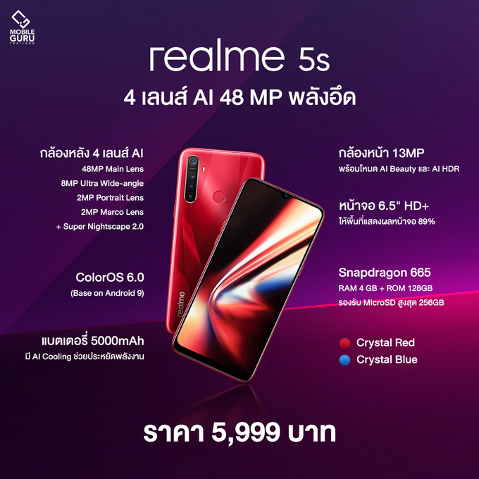 realme 5s เป็นการสานต่อความสำเร็จของ realme 5 Series ที่ได้รับเสียงตอบรับ และความนิยมเป็นอย่างสูง มาพร้อมดีไซน์ที่สวยงาม Diamond cut หน้าจอหยดน้ำ ขนาด 6.5 นิ้ว ติ่งหน้าจอมีขนาดเล็ก ทำให้หน้าจอดูกว้างขึ้น ความละเอียด HD+ และสเปคที่น่าสนใจ Qualcomm Snapdragon 665, RAM 4GB/ROM 128GB รองรับ MicroSD แถมจัดเต็มกล้อง 4 เลนส์ ความละเอียดสูง 48MP F1.8 + 8MP F2.2 + 2MP F2.4 + 2MP F2.4 และกล้องหน้าหยดน้ำความละเอียด 13MP F2.0 รวมทั้งแบตเตอรี่ความจุสูง 5,000 mAh สามารถใช้งานได้อย่างยาวนานอีกด้วย ราคา 5,999 บาท