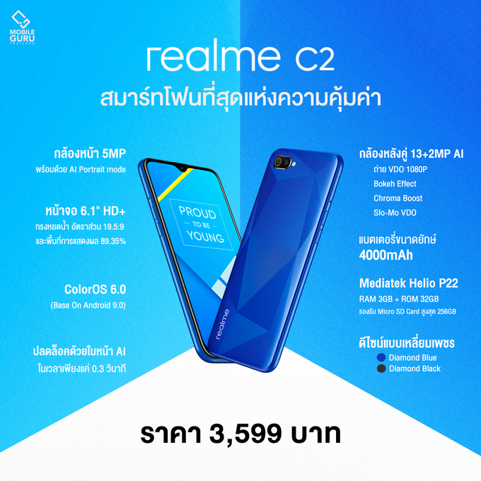 realme C2 คงคอนเซ็ปต์ของสมาร์ทโฟนรุ่นเล็กสเปคเด็ดไว้อย่างเหนียวแน่น ชูจุดเด่นด้วยดีไซน์ตัวเครื่องสวยงามแปลกตา ดีไซน์ฝาหลังสวยงามแบบ Diamond Cut หน้าจอ Dew drop ขนาด 6.1 นิ้ว ความละเอียด HD+ ใช้ชิปประมวลผล MediaTek Helio P22, GPU PowerVR GE8320, RAM 3GB/ROM 32GB รองรับ MicroSD, กล้องคู่ความละเอียด 13MP + 2MP และกล้องหน้าความละเอียด 5MP รองรับ AI ทั้งกล้องหลังและกล้องหน้า แบตเตอรี่ความจุสูงถึง 4,000 mAh สมชื่อนิยาม King of Entry-Level จริงๆ ใครที่สนใจ สามารถเป้นเจ้าของได้แล้ว ในราคาเพียง 3,599 บาท (จากราคา 3,999 บาท)