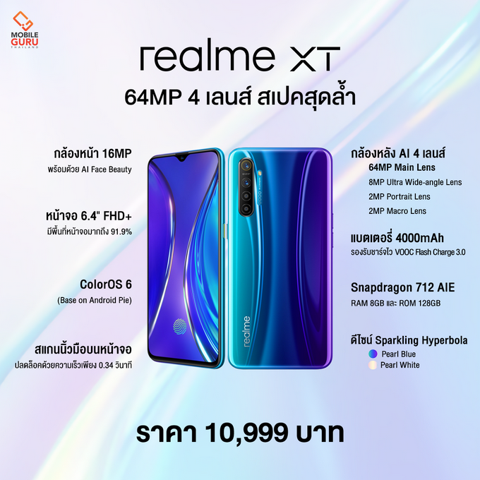 realme XT เป็นสมาร์ทโฟนสเปคแรง ดีไซน์พรีเมี่ยม ที่มาพร้อมกล้องความละเอียด 64MP รุ่นแรกที่มีวางจำหน่ายในประเทศไทย หน้าจอ Super AMOLED ขนาด 6.4 นิ้ว ความละเอียด Full HD+ ชิปเซ็ต Snapdragon 712 AIE, RAM 8GB/ROM 128GB รองรับ MicroSD, กล้อง 4 เลนส์ ความละเอียด 64MP F1.8 + 8MP F2.25 + 2MP F2.4 + 2MP F2.4 และกล้องหน้าความละเอียด 16MP F2.0 โดยรุ่นนี้ได้มีการทำงานร่วมกับช่างภาพชื่อดัง จาก National Geographic คุณ Aaron Huey ปัจจุบันดำรงตำแหน่ง realme Chief Photography Officer ของ realme กับการร่วมกันพัฒนากล้องถ่ายภาพที่ดีที่สุด และมาพร้อมแบตเตอรี่ความจุ 4,000 mAh รองรับเทคโนโลยีชาร์จไว VOOC 3.0 (สามารถชาร์จเต็ม 50% ใน 30 นาที) มีสแกนลายนิ้วมือใต้หน้าจอ ราคา 10,999 บาท
