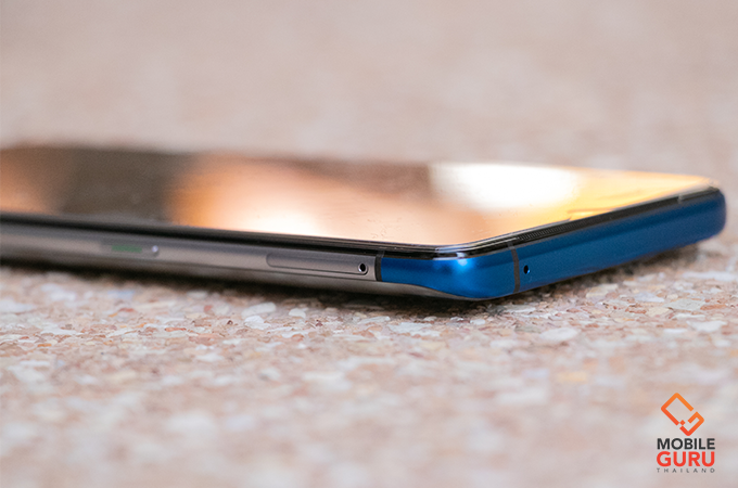 ด้านบนตัวเครื่อง บริเวณขอบตัวเครื่องทางออปโป้เลือกใช้สีน้ำเงินอมเงินเป็นสีสันด้านบนตัวเครื่อง