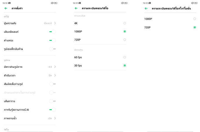 หน้าเมนูการตั้งค่ากล้องถ่ายรูป