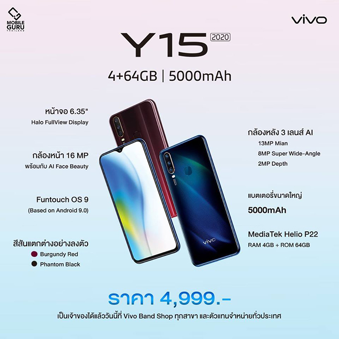 Vivo Y15 2020 วางจำหน่ายในราคาเพียง 4,999 บาทเท่านั้น โดยมีให้เลือกทั้งหมด 1 รุ่น 4GB RAM + 64GB ROM และตัวเลือกสี 2 สี คือ สีดำ-น้ำเงิน Phantom Black และสีแดง-ดำ Burgundy Red สามารถหาซื้อได้แล้ววันนี้ ที่ Vivo Brand Shop ทุกสาขา และร้านค้าตัวแทนจำหน่ายทั่วประเทศ