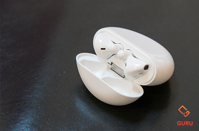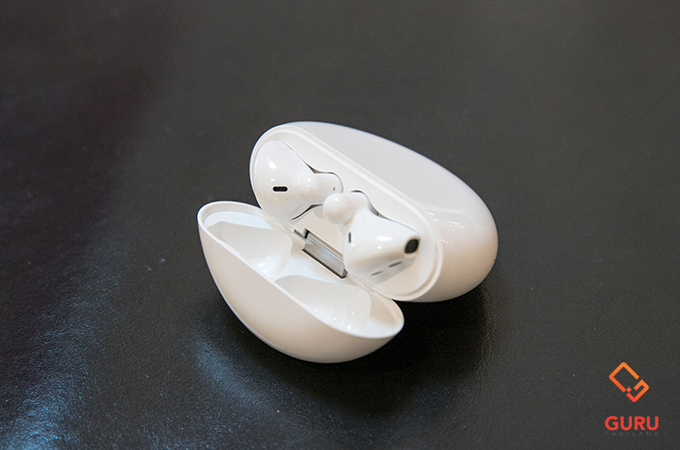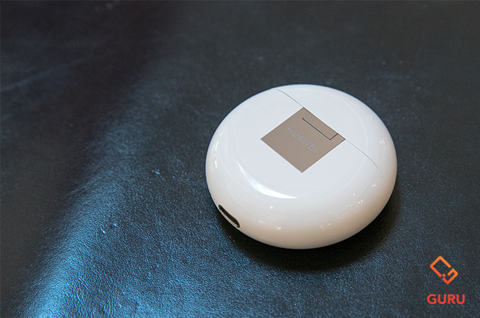 ตลับเคสที่ให้มาด้วย จะเป็นทรงกลมด้านหลังมีโลโก้ของหัวเว่ยแปะอยู่ ซึ่งตรงนี้ขอตินิดนึงว่า ตอนแรกที่ใช้งานหลายคนมักจะเข้าใจผิดว่าต้องเปิดฝาจากด้านของโลโก้ แต่จริงๆ เปิดด้านตรงข้ามนะครับ ในขณะที่ด้านล่างของตลับชาร์จที่พอร์ต USB-C และไฟแสดงสถานะการชาร์จ ส่วนเมื่อเปิดฝาแล้วด้านในจะร่องสำหรับใส่หูฟังลงไปและทำการชาร์จในตัว