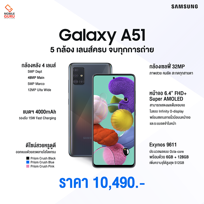 และในวันนี้ผมได้รับเครื่อง Samsung Galaxy A51 มาให้รีวิวให้ได้อ่านกัน สำหรับสมาร์ทโฟนรุ่นนี้แน่นอนว่าดีไซน์ภายนอกสวยมากๆ และเป็นดีไซน์ที่เหมือนเป็นแม่แบบของสมาร์ทโฟนซัมซุงในปีนี้ นอกจากนี้ยังมาพร้อมจุดเด่นมากมาย ไม่ว่าจะเป็นหน้าจอ Super AMOLED ที่สวยงาม กล้องหน้าแบบเจาะรู Infinity-O Display ชิปเซ็ต Exynos 9611 กล้องหลังดีไซน์ทรงสี่เหลี่ยม 4 เลนส์ ที่มาพร้อมกล้องมาโครเป็นครั้งแรกของซัมซุง แบตเตอรี่ความจุสูง 4,000 mAh มาพร้อมชาร์จเร็ว มีให้เลือก 3 สี ได้แก่ Prism Crush Black, Prism Crush Pink และ Prism Crush Blue จะเห็นว่าดูครบเครื่องทีเดียว สำหรับราคาเปิดตัว Samsung Galaxy A51 อยู่ที่ 10,490 บาท และ Samsung Galaxy A71 ราคา 13,990 บาท เป็นราคาที่น่าจะตัดสินใจกันได้ไม่ยาก จะน่าสนใจขนาดไหนมาดูกันเลยครับ