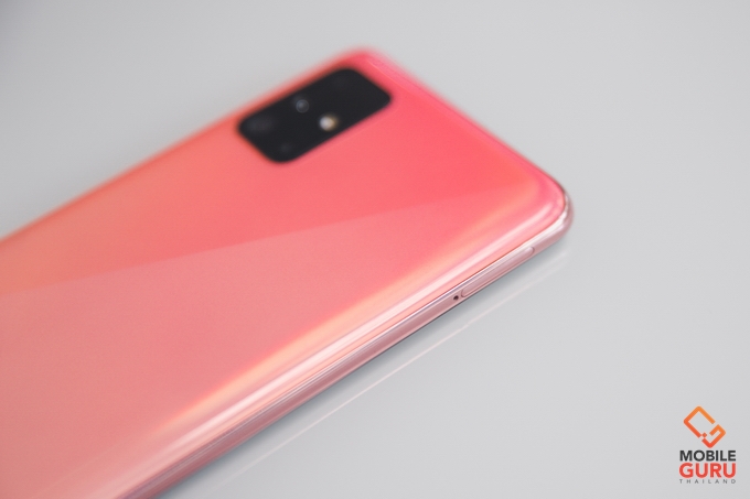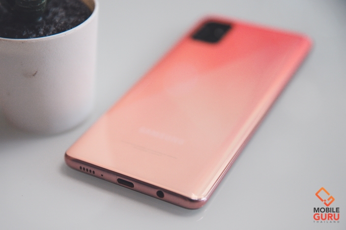 Samsung Galaxy A51 ด้านบนจะมีไมค์ตัดเสียงรบกวน ด้านล่างจะใช้พอร์ท USB Type-C, ไมโครโฟน, ลำโพง และยังคงมีพอร์ทหูฟัง 3.5 มม. มาให้ด้วย ไม่ได้ตัดออก ถูกใจคนที่ชอบฟังเพลงอย่างแน่นอน ส่วนด้านซ้ายมีช่องใส่ซิม ด้านขวามีปุ่มปรับระดับเสียง และปุ่ม Power