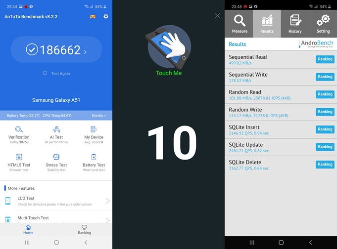 - ทดสอบด้วยแอปพลิเคชัน AndroBench ทำความเร็วในการอ่านอยู่ที่ 499.02 MB/s และการเขียน 178.52 MB/s (UFS 2.1 Storage)