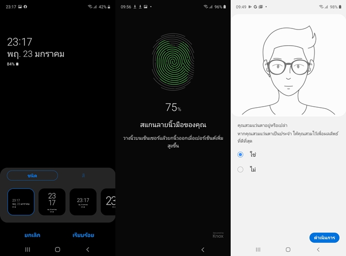 Samsung Galaxy A51 หน้าจอรองรับ Always-On Display และปลดล็อกหน้าจอด้วย Fingerprint ผ่านระบบรักษาความปลอดภัย Samsung Knox รองรับได้สูงสุด 3 ลายนิ้วมือ ความแม่นยำยังทำได้ไม่ดีนักนะครับ ต้องสแกนนิ้วแบบตั้งใจพอสมควร และรองรับสแกนใบหน้า Face Access