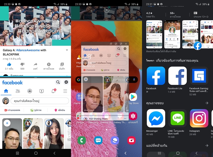 มี Smart Gesture ช่วยอำนวยความสะดวกในการใช้งาน เช่นแตะหน้าจอเพื่อเปิดหน้าจอขึ้นมาโดยไม่ต้องกดปุ่ม Power เป็นต้น และฟีเจอร์ Dual Messenger สามารถใช้งานแอปพลิเคชัน Social ได้ 2 ID ในเครื่องเดียว เช่น Facebook, Facebook Messenger, Line เป็นต้น ที่ผมชอบมากๆ ก็คือ Multi Window (การแบ่งหน้าจอ) ของซัมซุงครับ ลูกเล่นเยอะมากๆ ทั้งแบ่งหน้าจอปกติ การแสดงผลแบบ Pop-Up แถมยังสามารถปรับค่า Transparent เพื่อให้มองเห็นหน้าจออื่นๆ ได้ด้วย และสามารถย่อเก็บเป็นไอค่อนเล็กๆ บนหน้าจอ เพื่อสลับใช้งานอย่างง่ายๆ ได้ด้วย ทำให้การทำงานบนสมาร์ทโฟนมีความสะดวกมากๆ