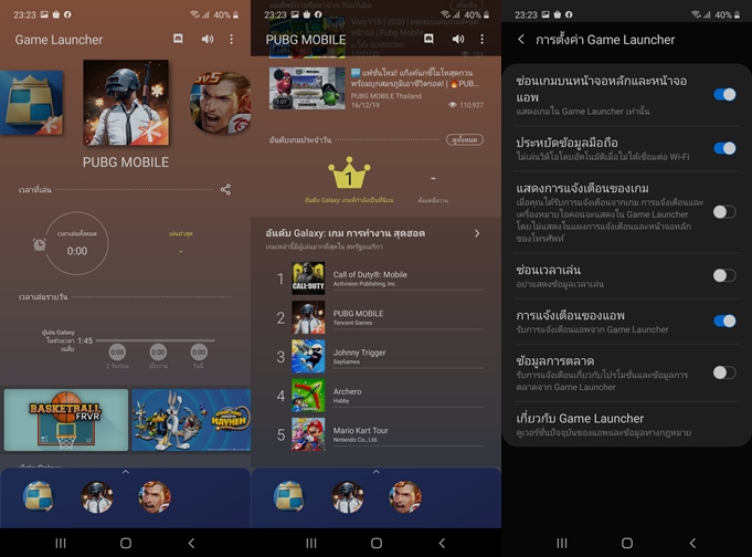 Game Launcher ฟีเจอร์รวมเกมทุกเกมบนสมาร์ทโฟนของเราเอาไว้ที่เดียว ปิดการแจ้งเตือนขณะเล่นเกม, ประหยัดพลังงานขณะเล่นเกม ทดสอบด้วยเกมยอดนิยมอย่าง ROV สามารถเล่นได้ที่ 54FPS - 60FPS อย่างลื่นไหลครับ การทัชหน้าจอทำได้ดีทีเดียว และทดสอบด้วยเกม PUBG สามารถกราฟิกระดับ HDR HD และค่าเฟรมเรทระดับ Ultra สำหรับเรื่องเกมผมให้สอบผ่านเลย ทำได้ดีมาก