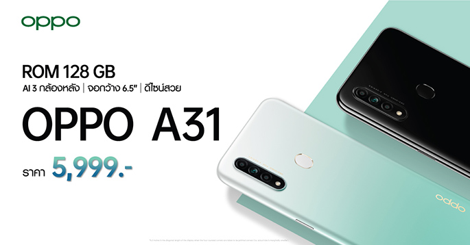 OPPO A31 วางจำหน่ายในราคาสุดคุ้มค่า เพียง 5,999 บาทเท่านั้น มาพร้อมหน่วยความจำ RAM 4 GB และพื้นที่ความจำภายในตัวเครื่อง 128 GB มีให้เลือกทั้งหมด 2 สี คือ สีดำ Mystery Black และสีขาว-เขียว Fantasy White สำหรับใครที่สนใจ ก็สามารถไปจับจองเป็นเจ้าของได้แล้ววันนี้ ที่ OPPO Brand Shop และร้านค้าตัวแทนจำหน่ายทั่วประเทศไทย