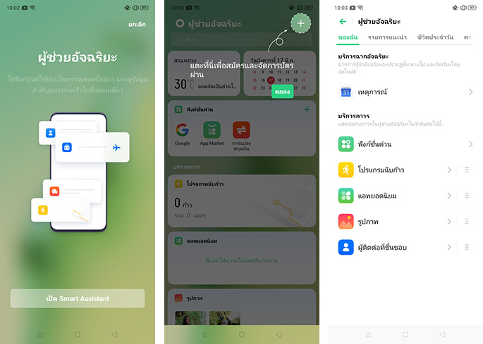จากหน้า Home เมื่อปัดไปทางด้านซ้ายจะเป็นระบบผู้ช่วยอัจฉริยะ แสดงหน้าเมนูลัดสำหรับการใช้งานฟังก์ชั่นด่วน โดยจะมีทั้งการแจ้งเตือนเหตุการณ์ต่างๆ ข้อมูลสภาพอากาศ ปฏิทิน โปรแกรมนับก้าว แอปยอดนิยม รายชื่อผู้ติดต่อที่ชื่นชอบ รูปภาพ และอื่น ๆ ซึ่งตรงนี้สามารถเลือกปรับแต่งให้เหมาะสมกับการใช้งานของแต่ละคนได้ตามชอบ นอกจากนี้ ในส่วนของฟีเจอร์เด่น ๆ ที่หลายคนชื่นชอบ อย่าง ฟีเจอร์แถบด้านข้างอัจฉริยะ ที่สามารถปัดเรียกแถบเมนูลัดออกมาจากขอบหน้าจอ เพื่อเข้าถึงเครื่องมือด่วนต่าง ๆ ก็ยังมีมาให้ใช้งานเช่นเคย