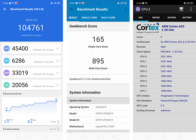 OPPO A31 ใช้ชิปประมวลผล MediaTek Helio P35, Octa-core ความเร็ว 2.3 GHz ทำงานร่วมกับชิปประมวลผลกราฟิก PowerVR GE8320 มาพร้อมความจำ RAM ขนาด 4 GB จับคู่กับหน่วยความจำ ROM 128 GB สามารถเพิ่มความจำได้สูงสุด 256 GB สามารถใช้งานโดยทั่วไปได้ลื่นไหล ดูหนัง ฟังเพลง และใช้งานแชทต่าง ๆ ทำได้ดี เล่นเกมไหลลื่น สลับแอปฯ ไปมาได้ ไม่ค้าง