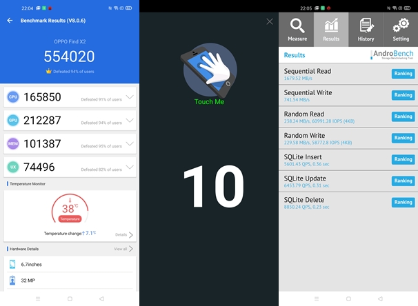 - ทดสอบด้วยแอปพลิเคชัน AndroBench ทำความเร็ว Storage ในการอ่านอยู่ที่ 1679.52 MB/s และการเขียน 741.54 MB/s (UFS 3.0)