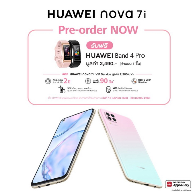 - Huawei Nova 7i รับฟรี Huawei Band 4 Pro มูลค่า 2,490 บาท + VIP Service มูลค่า 2,200 บาท