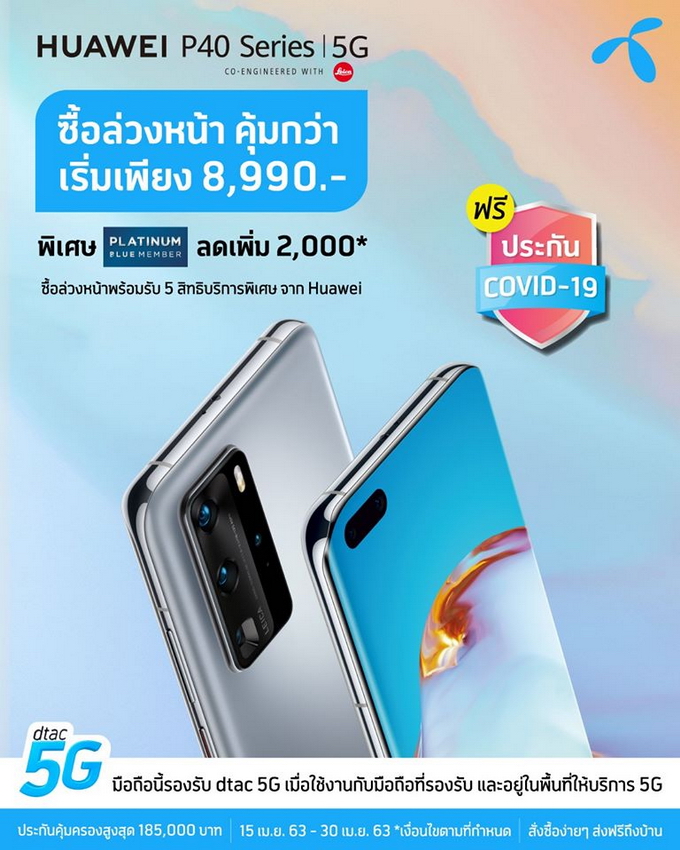 นอกจากนี้ หากซื้อ Huawei P40 5G และ Huawei P40 Pro 5G กับทาง AIS, TrueMove H, dtac พร้อมแพ็กเกจ มีของแถมพร้อมส่วนลดสูงสุด 22,000 บาท! พร้อมประกัน Covid-19 นาน 1 เดือน ใครที่สนใจไม่ควรพลาดนะครับ