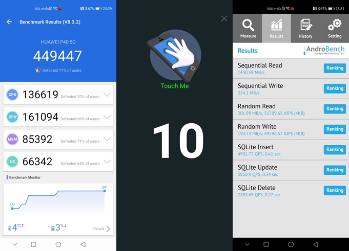 - ทดสอบด้วยแอปพลิเคชัน AndroBench ทำความเร็ว Storage ในการอ่านอยู่ที่ 1450.59 MB/s และการเขียน 234.1 MB/s (UFS 3.0)