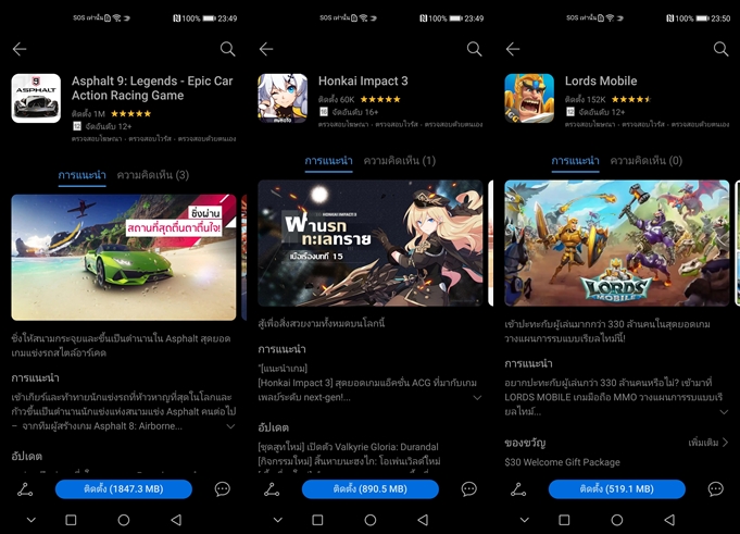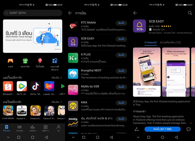 สำหรับ AppGallery ทางหัวเว่ยก็มีความตั้งใจที่จะผลักดันให้มันประสบความสำเร็จ ในตอนนี้มีผู้ให้บริการชั้นนำปล่อยแอปพลิเคชั่นของตัวเองลงใน AppGallery มากขึ้น และอย่างที่หลายๆ คนทราบ ตอนนี้แอปพลิเคชั่น Mobile Banking มีปล่อยออกมาครบทุกธนาคารแล้วครับ ส่วนแอปฯ Social ตอนนี้ยังไม่มีแอปพลิเคชั่นยอดนิยมมาให้อย่างเป็นทางการนะครับ แต่ว่าเราก็สามารถไปดาวน์โหลดผ่าน Store ทางเลือกอื่นๆ เช่น APKPure, Aptoide มาลงแทนได้ สามารถติดตั้งใช้งานได้อย่างสมบูรณ์ และเวลามีอัปเดตก็เข้าไปอัปเดตผ่านใน Store ได้เลย รวมไปถึงเกม และแอปพลิเคชั่นอื่นๆ ที่ไม่มีใน AppGallery ตอนนี้ด้วย แต่ถ้าเป็นแอปฯ ที่เรียกหา GMS เราก็จะไม่สามารถใช้งานได้นะครับ เช่น TrueID เป็นต้น (ใน AppGallery จะมีแต่ TrueID Lite ครับ ซึ่งฟีเจอร์แตกต่างกันมากๆ)