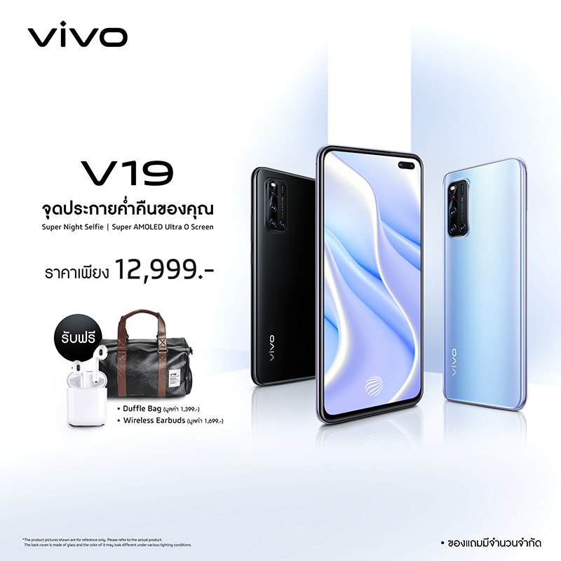 Vivo V19 วางจำหน่ายแล้วในราคา 12,999 บาท โดยมีให้เลือก 2 สีด้วยกัน ได้แก่ Gleam Black (สีดำ) และ Sleek Silver (สีเงิน) พร้อมรับของสมนาคุณ Wireless Earbuds มูลค่า 1,699 บาท, Duffle Bag มูลค่า 1,399 บาท สามารถจับจองเป็นเจ้าของได้แล้วที่ตัวแทนจัดจำหน่ายสมาร์ทโฟนชั้นนำทั่วประเทศ หรือสั่งซื้อผ่านช่องทางออนไลน์ได้ที่