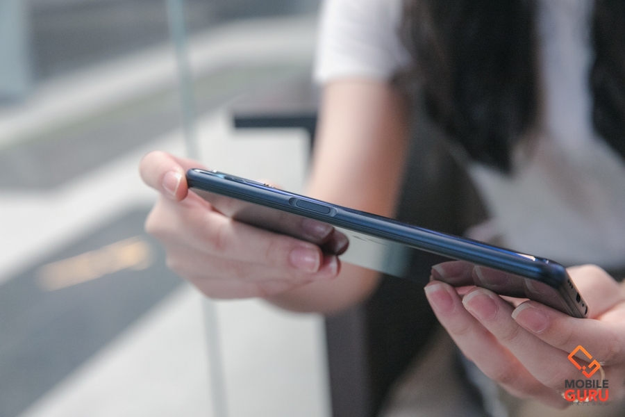 ขอบด้านข้างตัวเครื่อง จะเป็นวัสดุผิวด้านๆ สีเดียวกับฝาหลัง ด้านบนเรียบๆ, ด้านล่างมีพอร์ทหูฟัง 3.5 มม., ไมโครโฟน, พอร์ท USB Type-C และลำโพง, ด้านซ้ายมีช่องใส่ซิม และปุ่มปรับระดับเสียง และด้านขวาจะเป็นปุ่ม Power ที่ทำหน้าที่เป็นเซนเซอร์สแกนลายนิ้วมือ