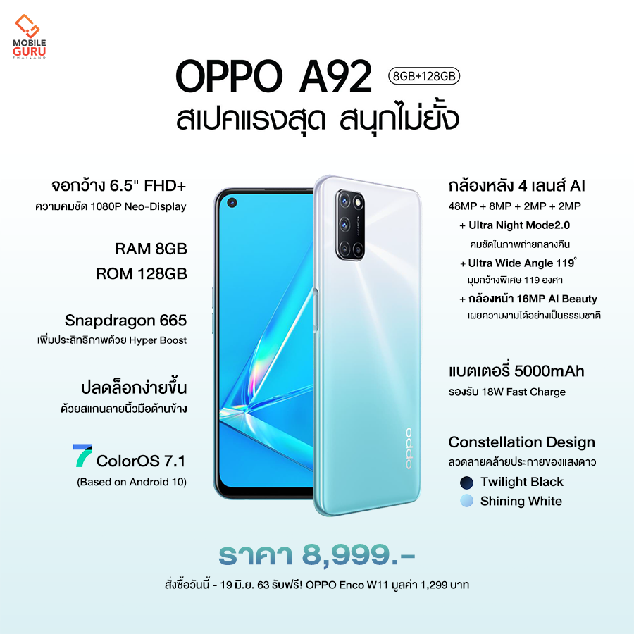 - ต่อที่ 2 รับส่วนลดหูฟังทันที! เมื่อซื้อ OPPO A92 พร้อม OPPO Enco W11 ราคาเพียง 999 บาท