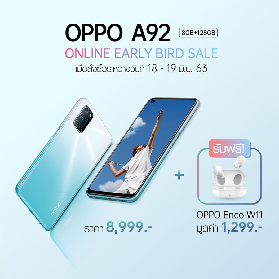 สำหรับใครที่สนใจสมาร์ทโฟน OPPO A92 สั่งซื้อระหว่างวันที่ 18 - 19 มิถุนายน 2563 (วางจำหน่าย 20 มิ.ย. 2563) รับฟรี! OPPO Enco W11 มูลค่า 1,299 บาท คุ้มค่าคุ้มราคาขนาดนี้ รีบเลย ของมีจำนวนจำกัด! หรือซื้อเครื่องกับ เอไอเอส, ดีแทค และทรูมูฟ เอช ราคาสุดคุ้ม เริ่มต้นเพียง 4,489 บาท