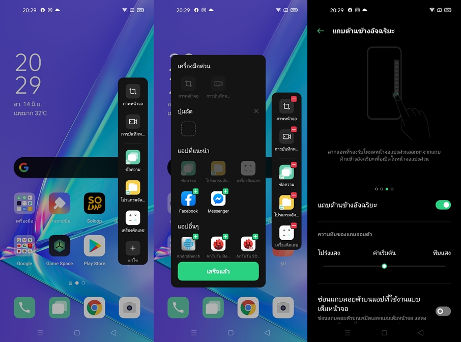 OPPO A92 ทำงานบน Android 10 ครอบทับด้วย ColorOS 7.1 มาพร้อมสเปคที่น่าสนใจ Qualcomm Snapdragon 665, GPU Adreno 610, RAM 8GB (LPDDR4X), ROM 128GB (UFS 2.1) รองรับ microSDXC หน้าตาการใช้งานสวยงามมากๆ ความเร็ว และความลื่นไหลทำได้ดีมาก รองรับ Dark Mode มีระบบผู้ช่วยอัจฉริยะ Smart Assistant และอำนวยความสะดวกในการใช้งานด้วย Smart Gesture มาพร้อมฟีเจอร์แถบด้านข้างอัจฉริยะ เพื่อเลือกใช้คำสั่งลัดต่างๆได้อย่างรวดเร็ว ทั้งการจับภาพหน้าจอ หรือการบันทึกหน้าจอในรูปแบบวีดีโอ ใครที่ชอบบันทึกหน้าจอในเวลาเล่นเกม หรือกำลัง VDO Call อยู่ ก็สามารถใช้งานฟีเจอร์นี้ได้เลยนะครับ สะดวกมากๆ
