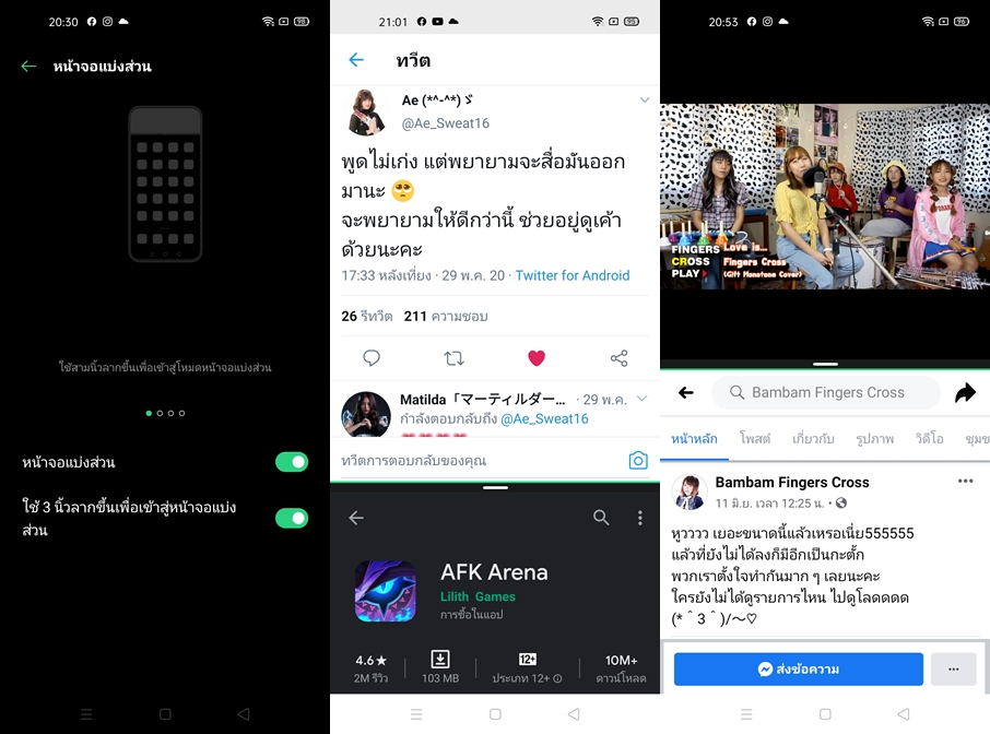 รองรับ App Split-Screen เป็นการแบ่งหน้าจอเป็น 2 ส่วน สามารถใช้งานแอปพลิเคชั่น ที่แตกต่างได้พร้อมๆกันในหน้าจอเดียว ความเร็วในการแสดงผล และสลับแอปพลิเคชั่น ทำได้ลื่นไหล สามารถเลือกใช้งานได้หลากหลายรูปแบบ ไม่ว่าจะเป็นการใช้ 3 นิ้ว การลากหน้าจอขึ้นเพื่อแบ่งหน้าจอ หรือไปที่ Recent App แล้วเลือกเครื่องหมายขีด 3 ขีดด้านขวา แล้วเลือกคำสั่งแบ่งหน้าจอ