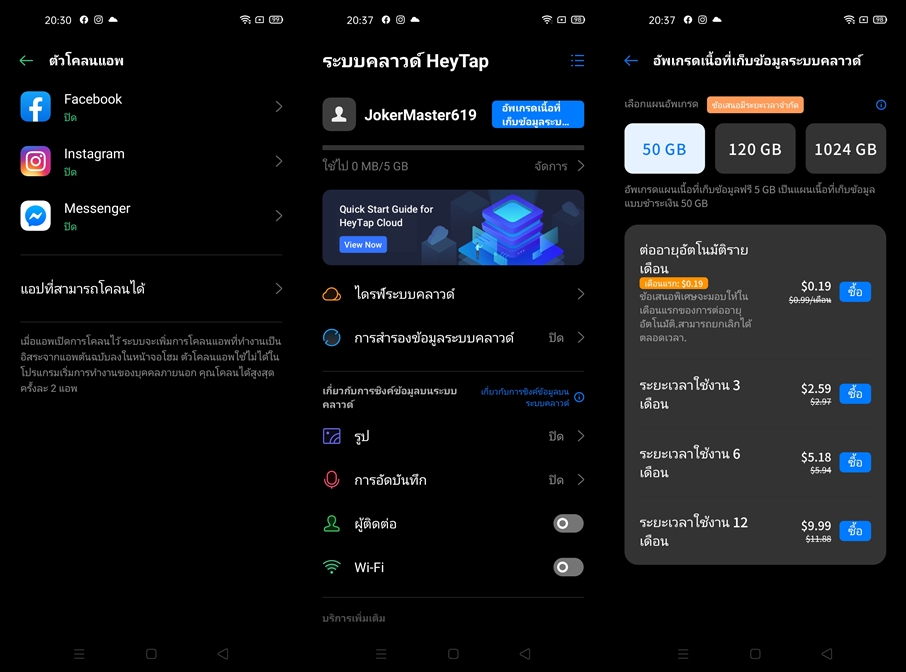 นอกจากนี้ฟีเจอร์ยอดนิยมอย่าง ฟีเจอร์โคลนแอปพลิเคชั่น สามารถใช้งานแอปพลิเคชั่นโซเชียลยอดนิยมได้พร้อมกัน 2 แอคเคาท์ ในสมาร์ทโฟนเครื่องเดียว เช่น Facebook, Facebook Messenger, Instagram หรือ Line เป็นต้น ก็มีมาให้เลยครับ ไม่ต้องไปหาดาวน์โหลดมาเพิ่ม และทาง OPPO มีระบบ Cloud ของตัวเองเรียกว่า HeyTap Cloud สามารถใช้งานได้ฟรี 5GB และสามารถซื้อความจุเพิ่มได้ 50GB, 120GB และสูงสุด 1TB ใครใช้ไม่พอสามารถซื้อเพิ่มได้เลย