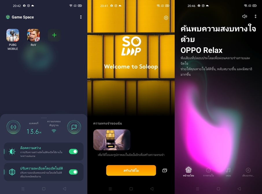 OPPO มีมาให้ครบทั้ง App Market, Game Center และ Theme Store มีทั้งฟรี และเสียค่าใช้จ่ายครับ ใครที่หาแอปพลิเชั่นที่ไม่มีใน Play Store ก็สามารถเข้าไปดาวน์โหลดกันได้ผ่านบริการของออปโป้ได้เลย และทาง OPPO ก็ยังมีฟีเจอร์ที่น่าสนใจอย่าง Game Space และเทคโนโลยี Hyper Boost เป็นฟีเจอร์เพิ่มประสิทธิภาพในการเล่นเกม จัดสรรพลังงาน, ปรับแต่งประสิทธิภาพ, จัดการการโทร, ข้อความ และการแจ้งเตือนระหว่างการเล่นเกม เพื่อประสบการณ์การเล่นเกมที่ดีที่สุดบนสมาร์ทโฟนของออปโป้ และมาพร้อมแอปพลิเคชั่น Soloop สามารถตัดต่อ และปรับแต่งวีดีโอ ผ่านเทมเพลตสุดเท่ ที่มีความหลากหลาย สามารถสร้างงานวีดีโอแบบสำเร็จรูปได้อย่างง่ายดาย และ OPPO Relax แอปฯ แสดงภาพและเสียงเพลง รวมไปถึงเสียงรบกวน ที่ทำให้เรารู้สึกผ่อนคลาย ช่วยให้เรานอนหลับง่ายยิ่งขึ้น หรือเปิดใช้งานตอนเราออกกำลังการอย่างการเล่นโยคะ หรือตอนทำสมาธิ ผมว่ามันใช้งานได้ผลมากๆ เพราะผมก็มีอาการนอนหลับยากเหมือนกัน