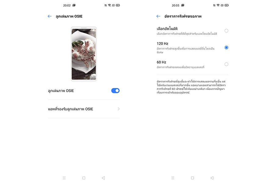 นอกจากนี้ตัวหน้าจอยังรองรับการแสดงผลอัตรา Refresh Rate ได้สูงสุดที่ 120Hz ซึ่งเราสามารถเลือกปรับค่าแบบแมนนวลได้เองระหว่าง 60Hz กับ 120Hz นอกนั้นจะเป็นการเปิดให้ระบบปรับให้อัตโนมัติตามการใช้งาน และยังไม่พอ! ทาง realme ยังใส่ซอฟต์แวร์เร่งสีของภาพ OSIE มาให้ด้วย ซึ่งตัวซอฟต์แวร์จะช่วยเร่งสีสันของภาพให้จัดจ้านขึ้นจากปกติ ทำให้ได้อรรถรสเวลารับชมคอนเทนท์ต่างๆ ได้ดีขึ้น โดยเราสามารถเข้าไปปรับเลือกเปิด-ปิดการใช้งานกับแอปพลิเคชั่นต่างๆ ได้ตามใจชอบเลย