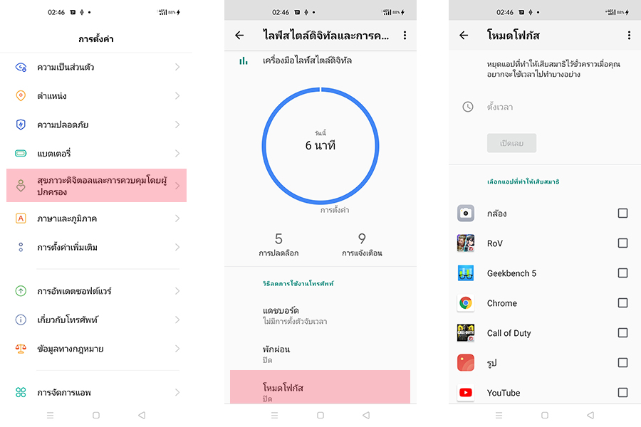 - Focus Mode - โหมดที่จะช่วยให้ผู้ใช้งานผ่อนคลายจากโลกภายนอก โดยระบบจะเปิดเพลงสบายๆ พร้อมเปิดโหมดห้ามรบกวน (DND หรือ Do Not Disturb) เพื่อปิดการแจ้งเตือนต่างๆ ที่อาจรบกวนสมาธิ โดยสามารถเข้าไปตั้งค่าได้ใน "การตั้งค่า" - "สุขภาวะดิจิตอลและการควบคุมโดยผู้ปกครอง" - "โหมดโฟกัส"