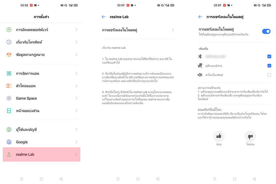 - Dual Mode Music Share - การแชร์เพลงในโหมดคู่ ที่สามารถเชื่อมต่อหูฟังไร้สายได้พร้อมกัน 2 เครื่อง โดยจะเชื่อมต่อหูฟัง Bluetooth 1 คู่ และหูฟังแบบต่อสายอีก 1 คู่ (โหมดนี้เป็นเวอร์ชันเบต้า สามารถทดลองใช้งานได้ที่หน้า realme Lab)