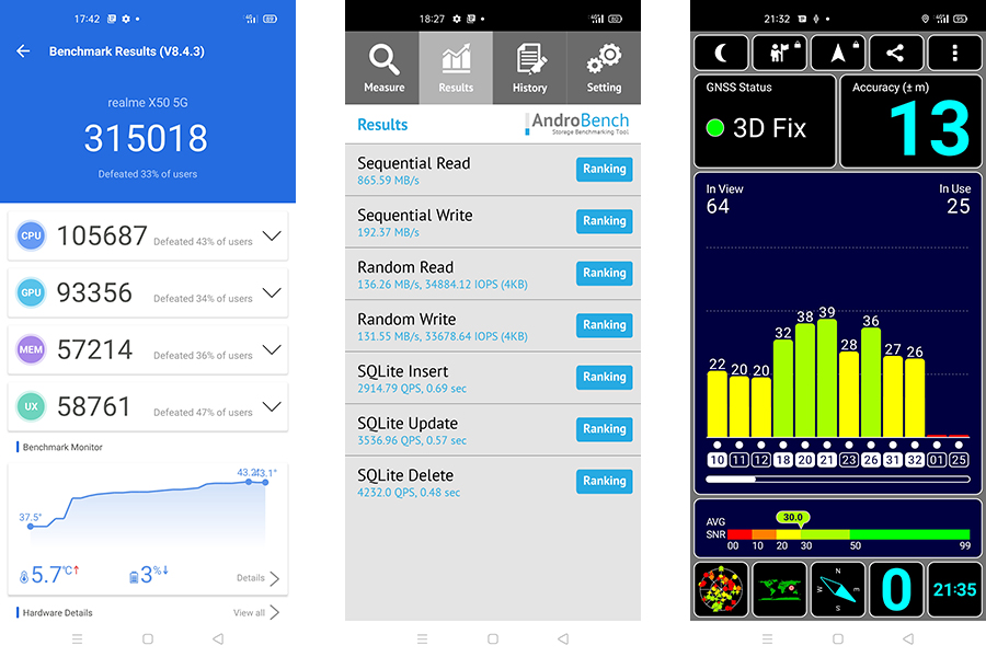 - ทดสอบความเร็วในการอ่าน-เขียนของหน่วยความจำด้วยแอปพลิเคชั่น AndroBench ได้ Sequential Read 865.59 MB/s | Sequential Write 192.37 MB/s