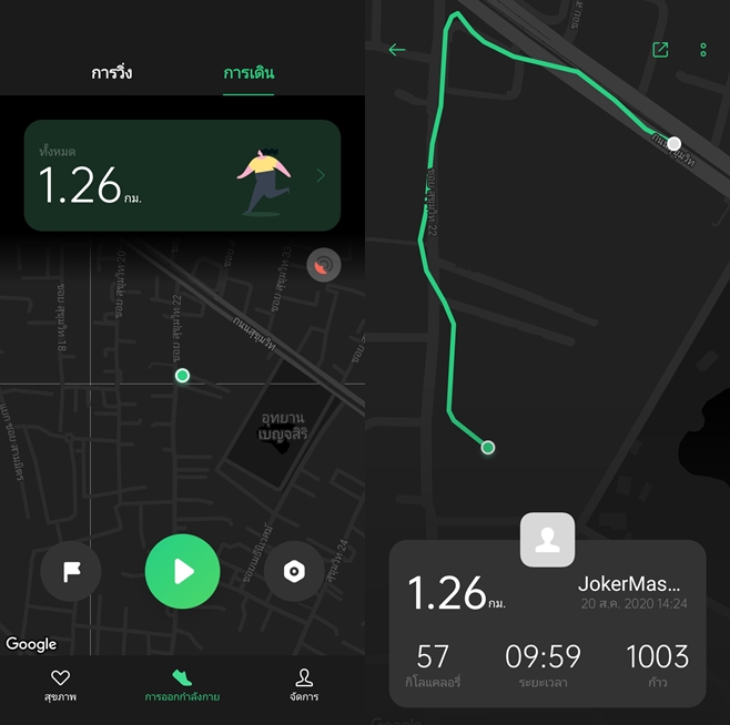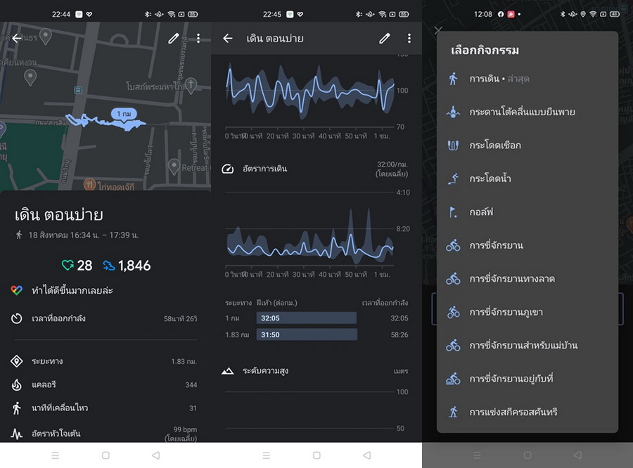 - ฟีเจอร์ Fitness Run, 5-Min Workouts, Fat Burn Run, Outdoor Walk, Outdoor Cycling, Swimming