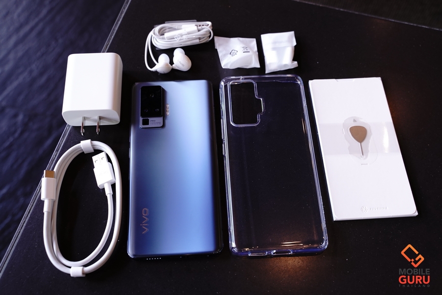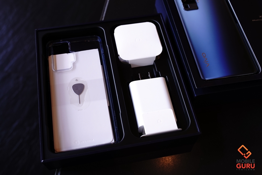 Vivo X50 Pro 5G มาพร้อมกล่องขนาดใหญ่ที่ดูพรีเมี่ยม อุปกรณ์ในกล่องจะมี ตัวเครื่อง, อะแดปเตอร์ พร้อมสาย USB Type-C, หูฟังแบบ In-Ear, จุกยางหูฟัง, ตัวแปลง USB Type-C to 3.5 มม., เคสใส, เข็มจิ้มซิม และคู่มือ