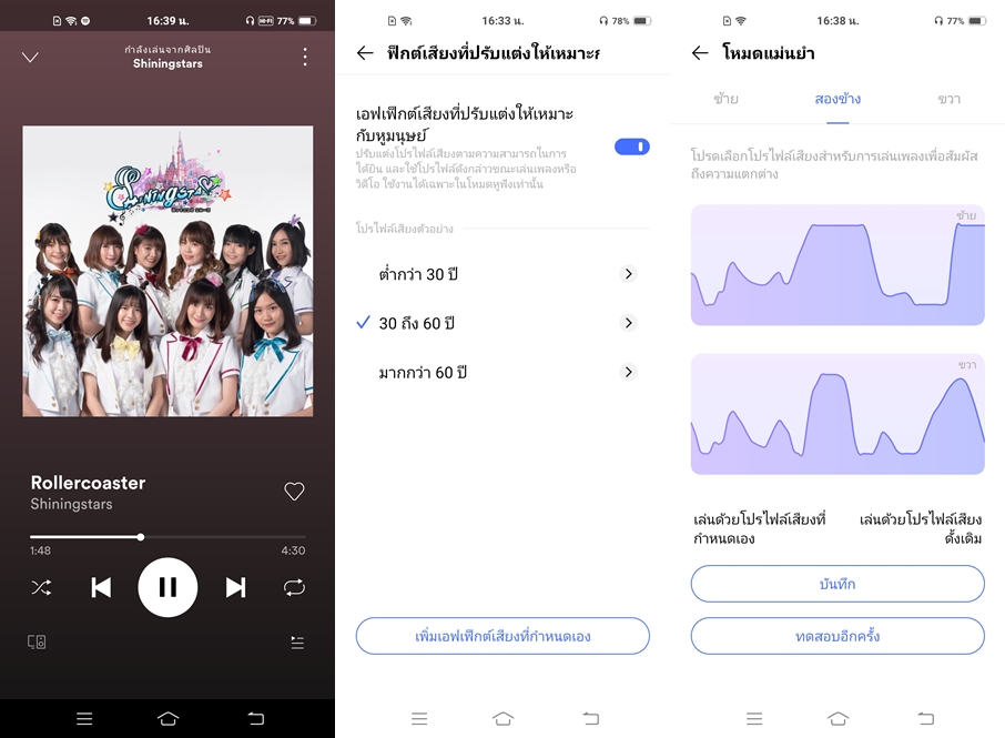 Vivo X50 Pro 5G รองรับระบบเสียง Hi-Fi โดยมาพร้อมชิปเสียง AK4377A (ตัวเดียวกับที่ใช้ใน Vivo NEX3) สามารถปรับแต่งเสียงให้เข้ากับความสามารถทางการได้ยินส่วนบุคคลได้ด้วยนะครับ แนะนำให้ลองปรับกันก่อนฟัง เสียงจะดีขึ้นอย่างชัดเจนเลย สามารถตั้งค่าแบบง่ายๆตามช่วงอายุ หรือปรับแต่งอย่างละเอียดเป็นรายบุคคลก็ได้ ทดสอบฟังกับหุฟังที่แถมมา คุณภาพน่าพอใจทีเดียวครับ ถ้าได้จับคู่กับฟังตัวโปรดของเพื่อนๆ จะต้องยิ่งถูกใจอย่างแน่นอน