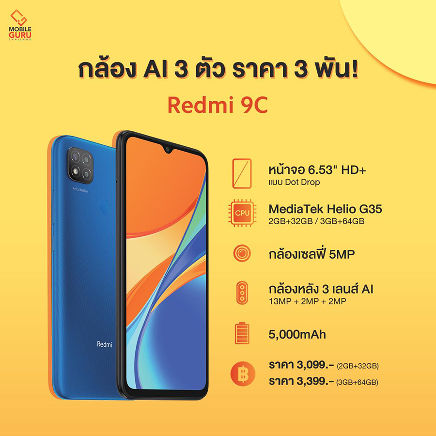 - Redmi 9C รุ่น RAM 2 GB + ROM 32 GB ราคา 3,099 บาท