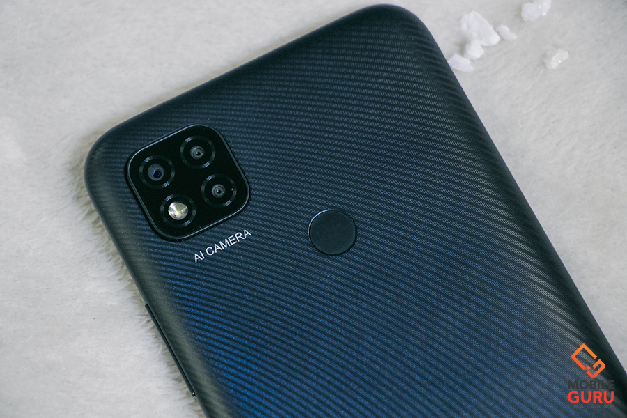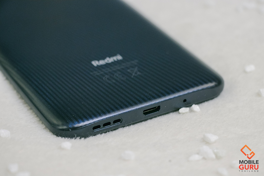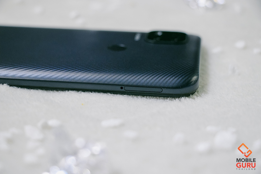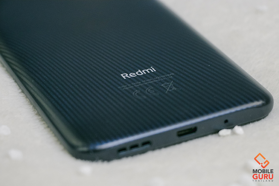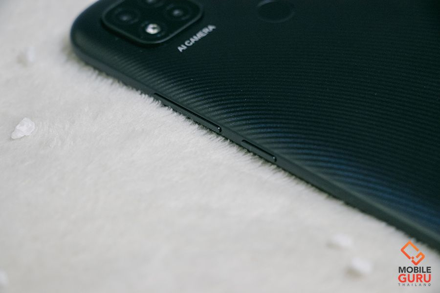 ทางด้านฝาหลังมาพร้อมดีไซน์สวยงาม ออกแบบโค้งรับกับฝ่ามือ และโดดเด่นสะดุดตาด้วยการเล่นลวดลายเป็นริ้ว ๆ เส้น ๆ มองผ่าน ๆ แอบคิดว่าดูหมือนลาย Kevlar อยู่เหมือนกัน เอาเป็นว่าตัวเครื่องที่ควรจะดูเป็นสีพื้นธรรมดา ๆ ดูเด่นขึ้นมาด้วยลายพวกนี้เลย ผิวสัมผัสเป็นแบบด้านนะคะ จุดนี้ช่วยให้รู้สึกจับถือได้มั่นใจมากยิ่งขึ้น โดยที่ไม่ต้องกังวลว่าจะทำร่วงหลุดมือนั่นเอง โดย Redmi 9C มีให้เลือกด้วยกันทั้งหมด 3 สี คือ สีน้ำเงิน Twilight Blue ให้ความรู้สึกสดใส มีชีวิตชีวา, สีส้ม Sunrise Orange สีนี้จี้ดจ๊าดมาก ให้ความรู้สึกร้อนแรง สนุกสนาน และสีที่เราหยิบมารีวิวให้ชมกันในวันนี้ สีเทา Midnight Grey สีแห่งความคลาสสิก และความสุขุมค่ะ