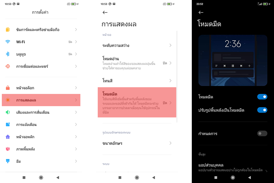 - โหมดมืด (Dark Mode) สำหรับการใช้งานในตอนกลางคืน โดยพื้นหลังจะเปลี่ยนเป็นสีดำ เพื่อช่วยในเรื่องของสุขภาพสายตา สามารถกำหนดเวลาว่าจะเริ่มเปิดใช้ตอนกี่โมง ปิดใช้งานตอนกี่โมงได้ด้วย สามารถเข้าไปเปิดการใช้งานได้ที่ "การตั้งค่า" > "การแสดงผล" > "โหมดมืด"