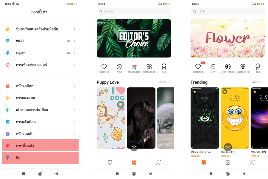 - ภาพพื้นหลัง (Wallpaper) และธีม (Theme) สามารถเลือกปรับแต่งภาพพื้นหลังหรือธีมให้กับเครื่องได้ง่าย สะดวก รวดเร็ว แถมมีลายน่ารัก ๆ ให้เลือกเยอะแยะไปหมด เข้าไปปรับแต่งได้ที่ "การตั้งค่า" > "ภาพพื้นหลัง" และ "การตั้งค่า" > "ธีม"