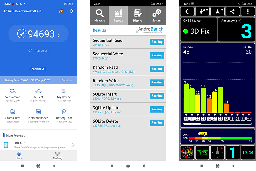 - ทดสอบความเร็วในการอ่าน-เขียนของหน่วยความจำด้วยแอปพลิเคชั่น AndroBench ได้ Sequential Read 264.06 MB/s | Sequential Write 178.24 MB/s